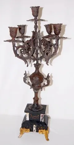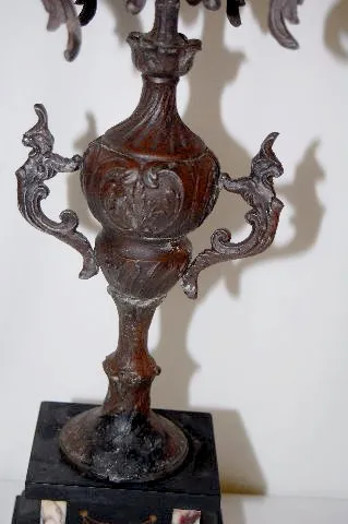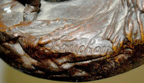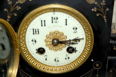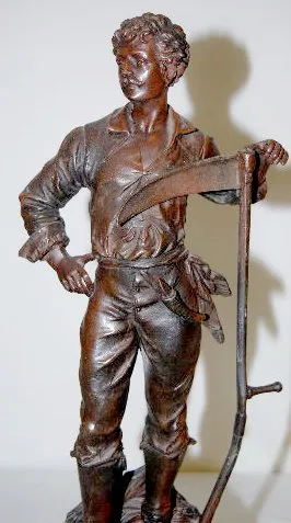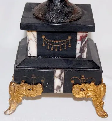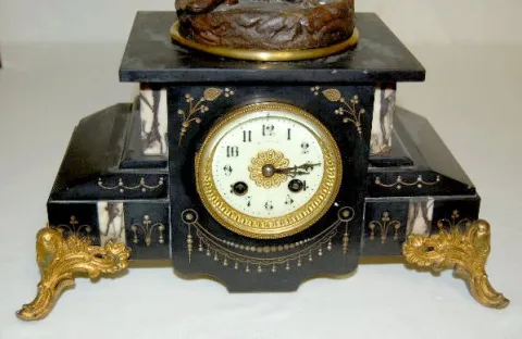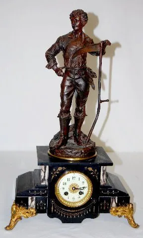 The bell striking movement is also marked "Rollsen Paris" & "No. 5299". In a slate case with marble inserts. The white metal figure of a man with a sc...