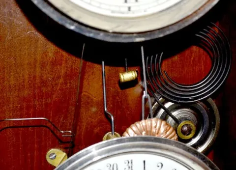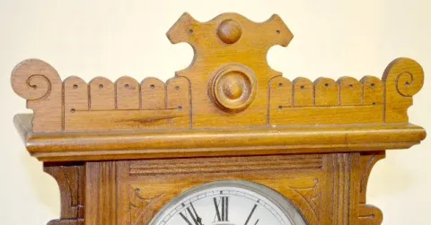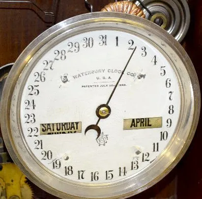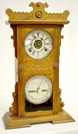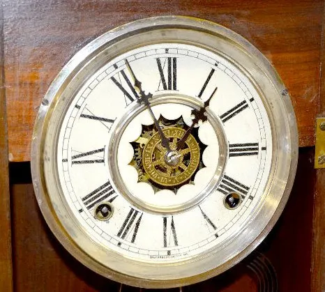 There is an 8 day T&S with alarm movement and 2 marked dials - one paper and one painted. The case has a clear glass door and a label on the back. The...