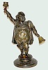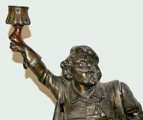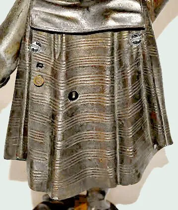 The works are marked "65". The metal case is unmarked; his belly is his dial; his arms move and a bell rings when wound. He could also be a candlehold...