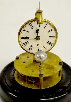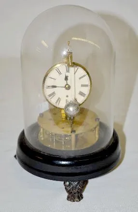 With brass works; a wood base; dome and a paper dial. (The clock is not running at this time.) 8 1/2" Tall...
