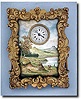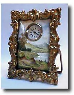 Enamel Easel Clock, c. 1870 Lovely continental gilt and enamel easel clock. Very ornate heavy cast gilt brass frame with a beautifully painted scene of a couple in a dramatic landscape. Gilt 3/4 plate keywind cylinder movement. A wonderful little clock in unusually fine condition. Case Excellent Height 4 inches Dial Excellent Circa 1870 Movement Like New