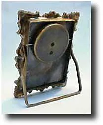 Lovely continental gilt and enamel easel clock. Very ornate heavy cast gilt brass frame with a beautifully painted scene of a couple in a dramatic landscape. Gilt 3/4 plate keywind cylinder movement. A wonderful little clock in unusually fine condition. Case Excellent Height 4 inches Dial Excellent Circa 1870 Movement Like New