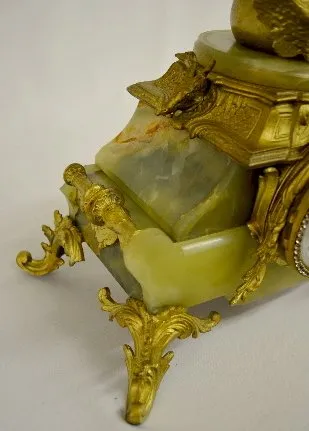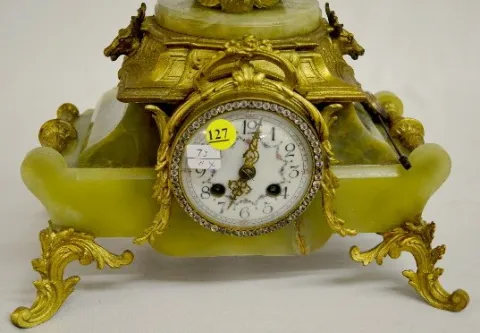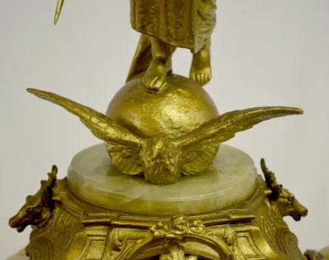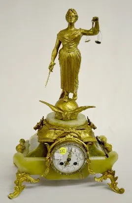 With a T&S movement signed "Made in France" "H&H" and numbered 1520. There are paste brilliants around the dial; The case has a statue of a lady holdi...