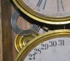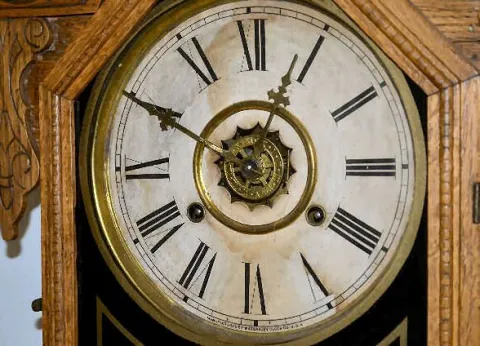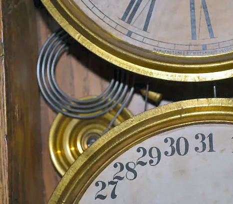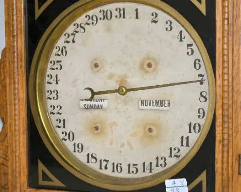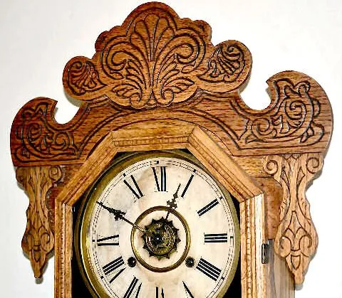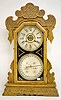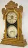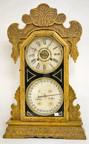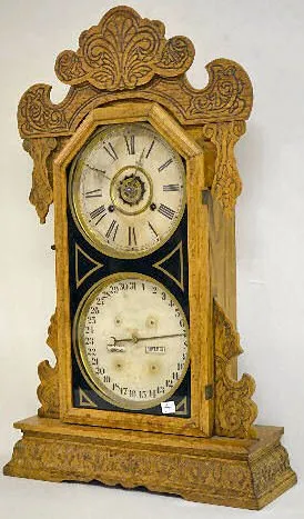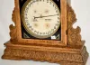 With an 8 day T&S with alarm movement. It has a marked paper dial and is in a golden oak case with pressed design. The door is painted black and gold....