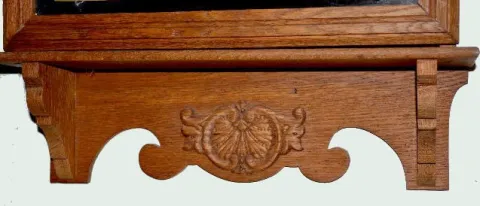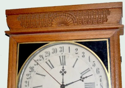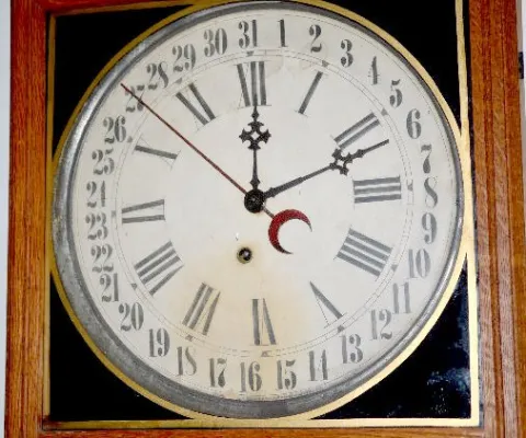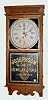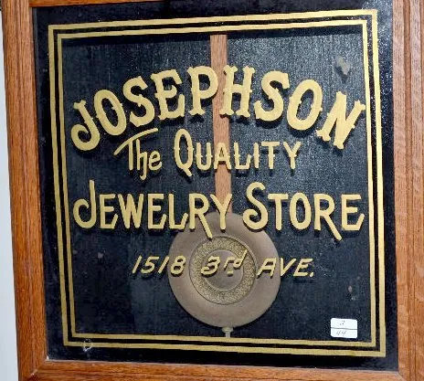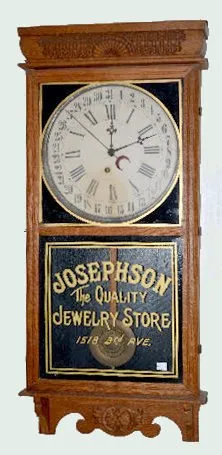 In an oak case with a TO movement; an unmarked calendar dial and the pendulum. The glass on the door advertises "Josephson The Quality Jewelry Store 1...