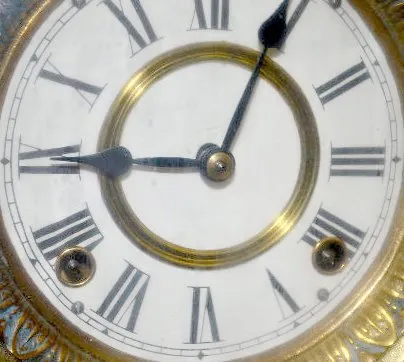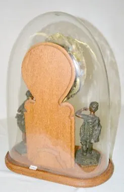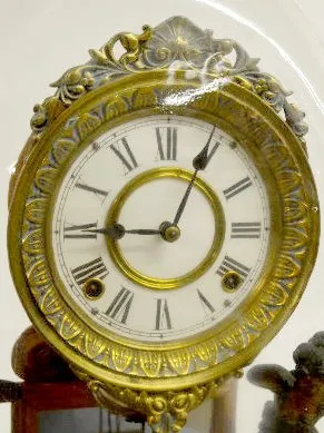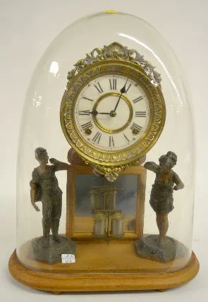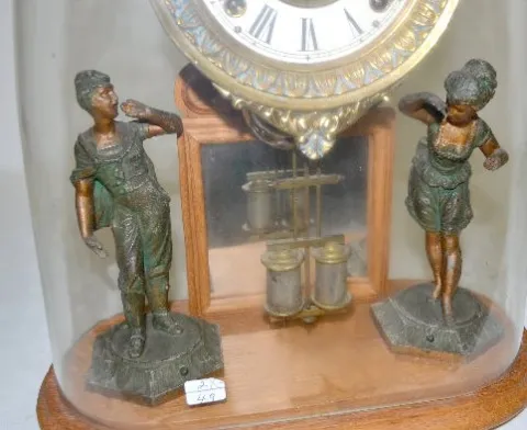With an 8 day T&S movement; an unmarked paper dial; male and female statues and the pendulum. The clock is running and striking at this time. (The dia...