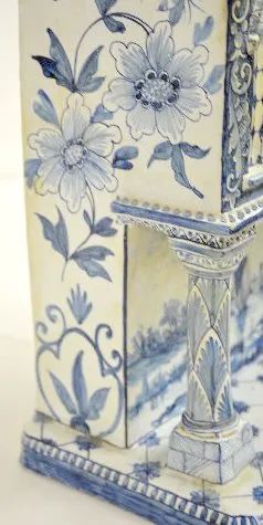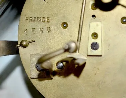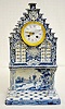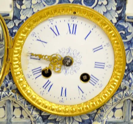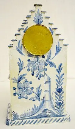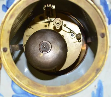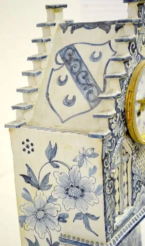 The bell strike movement is marked "France" and numbered 1598. The blue and white decorated case has shield-like shapes with 3 crescents in them. Ther...