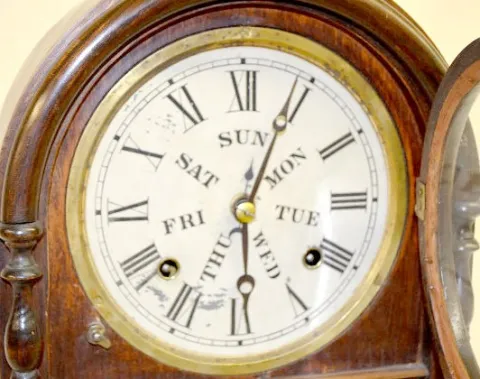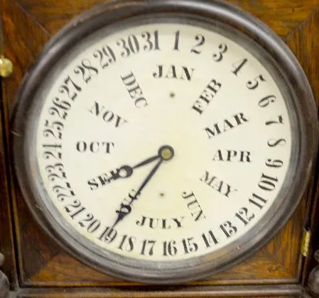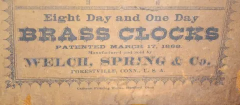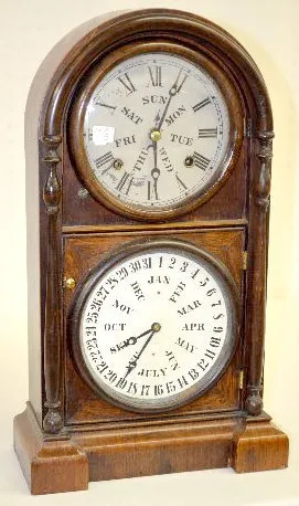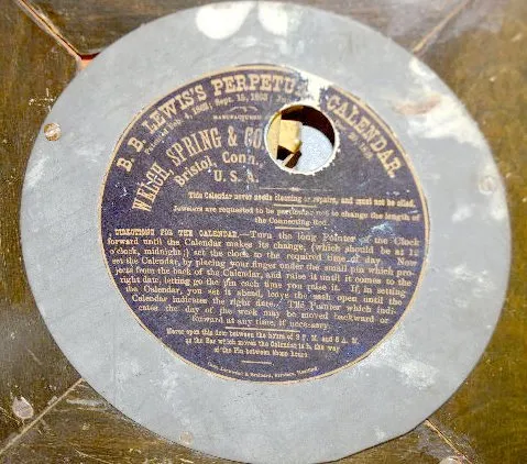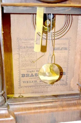 With a T&S movement, a tin upper dial and a painted tin lower dial. In a veneer case with Welch & BB Lewis interior labels. The key and pendulum are w...