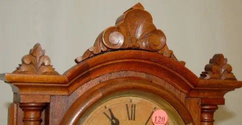 double dial shelf model carved walnut case; stained upper dial; great inside label. (Minor separations in wood dial surrounds.) 22"...