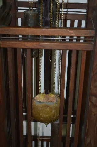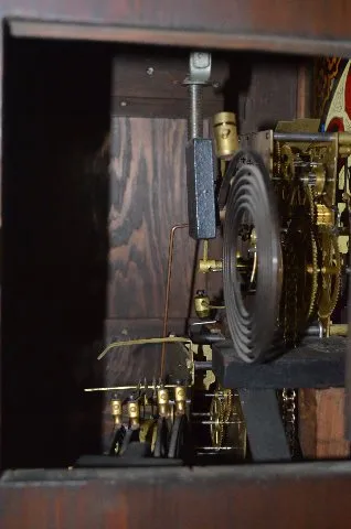 The chain wound movement strikes on 4 small gongs and one large cathedral gong. The dial is reverse painted on glass. The cage-like case is made of pi...