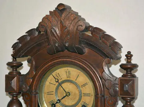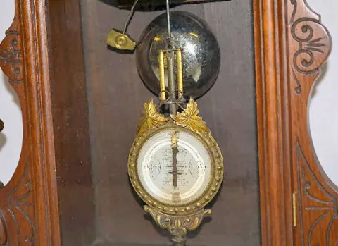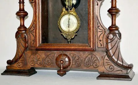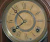 With an 8 day T&S movement; an unmarked enamel dial and a glass pendulum with an enameled chart dial behind it. The clock is running and striking at t...