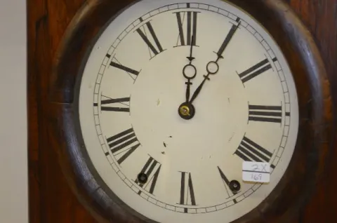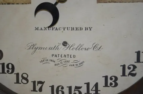 In a walnut case with an 8 day T&S movement; an unmarked metal upper dial; a metal bottom dial signed "Manufactured by Plymouth Hollow Ct." Not tested...