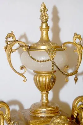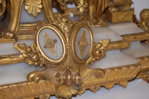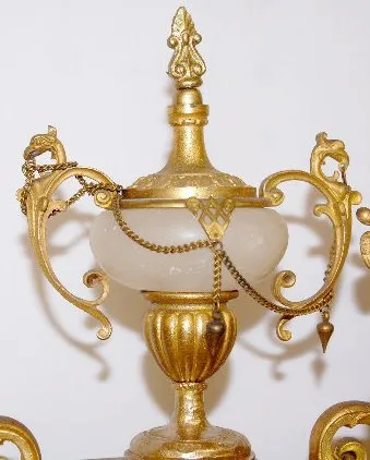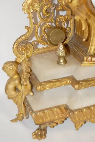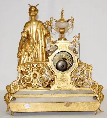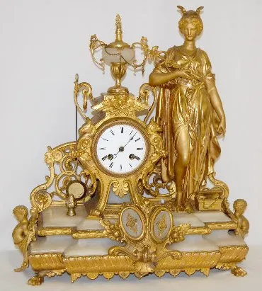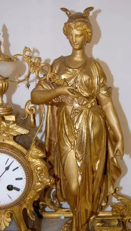 The bell striking movement is No. 9393 and has an open escapement dial. The Mercury-like lady holds a serpent scepter and wears a winged cap. There ar...