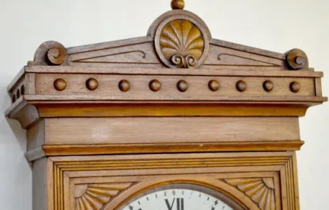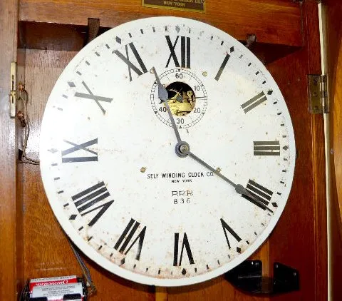 With a metal dial that reads "Self Winding Clock Company New York P.R.R. 836" in black letters. The carved solid oak case, which has matching carving ...