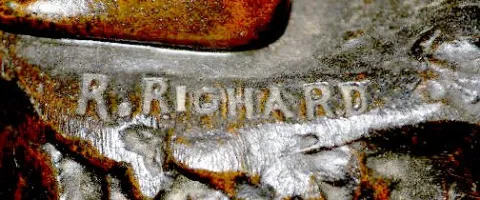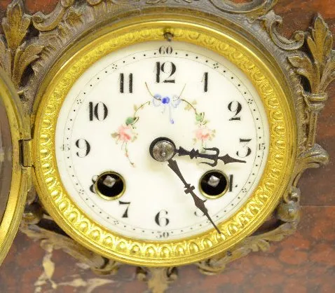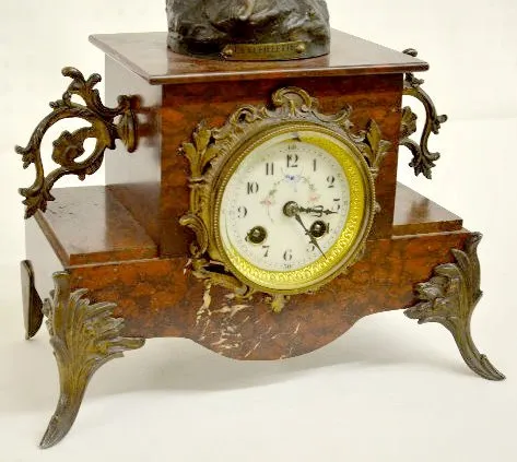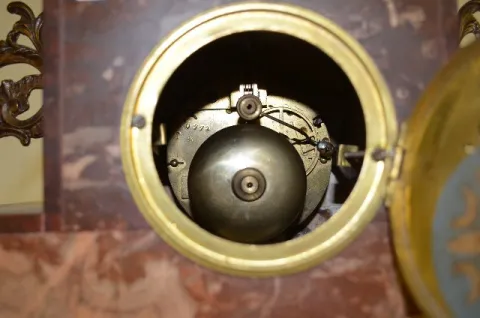 With 1/2 hour bell striking movement, No. 30771. The figure, designed by A. Richard (?), on top of the red marble case is of a young woman with a bask...