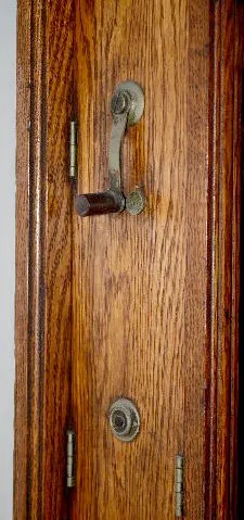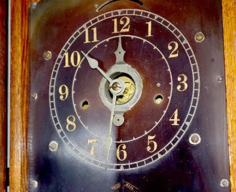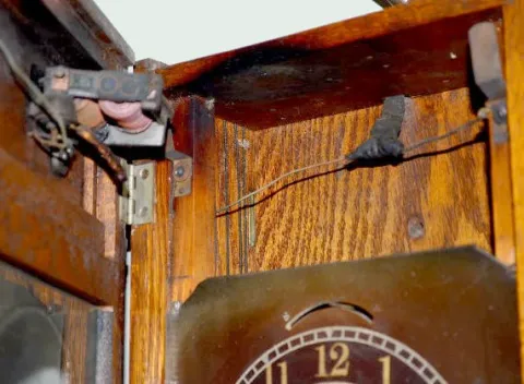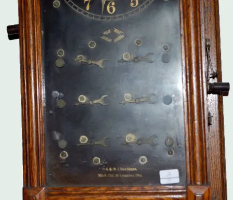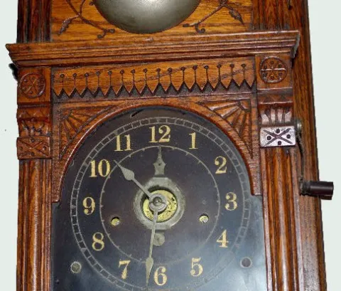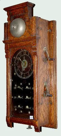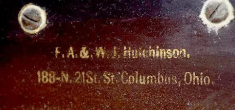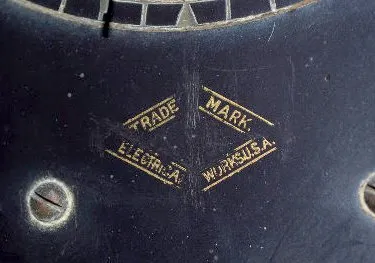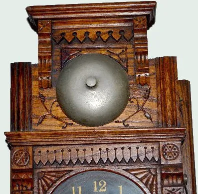 With an 8 day T&S movement; a black clock face marked "F.A. & W.J. Hutchinson & Trade Mark Electra Works, U.S.A." and a large bell on the top front. N...