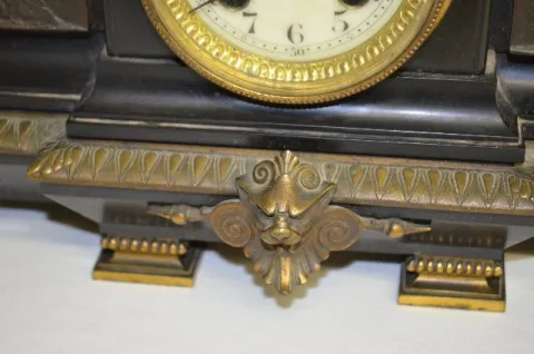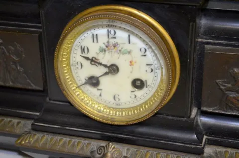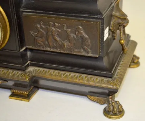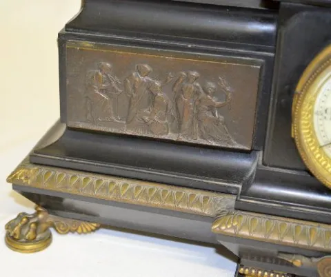 With a T&S movement marked "Japy Freres" and numbered 27995; an unmarked floral porcelain dial and the pendulum. The slate case has a Grecian scene fr...