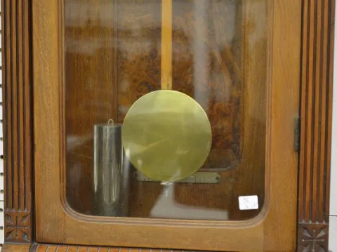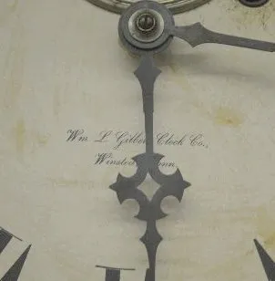 In an walnut case with a paper dial on a nickel pan - marked "Gilbert"; glass panel sides; the pendulum and the key; walnut case. Not tested. 46 1/2" ...