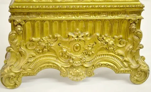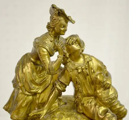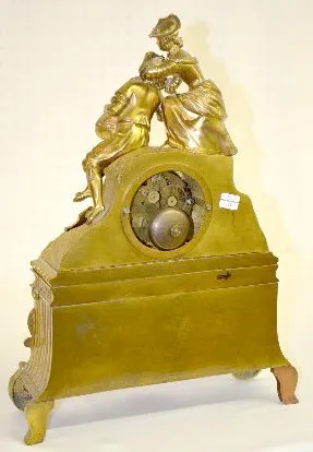 In the style of Charles X. The silk string movement strikes a cup bell. The brass dial sits below a man and woman in early dress. The case front has G...