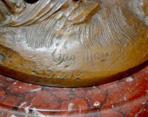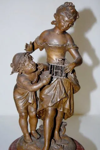The bell striking movement is No. 5440. "NORA" is on the enamel dial. There is another non-legible name below the center decoration. August Moreau des...
