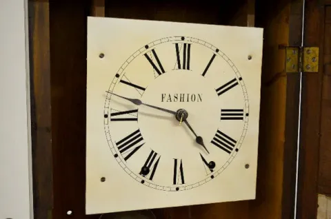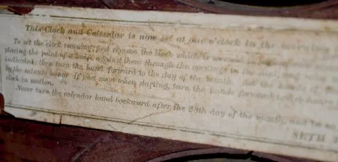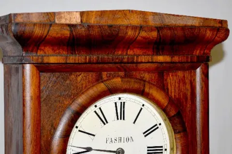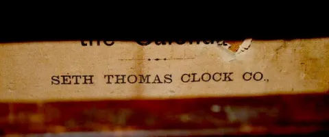 With an 8 day T&S movement. In a mahogany veneer case with paper dials and a Seth Thomas label on the door. The pendulum and key are with the clock. N...