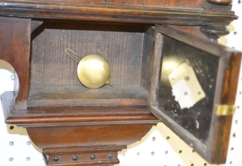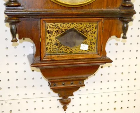 With a T&S movement; an unmarked paper dial; a paper label on the back and the pendulum. Not tested. (The dial is stained.) 30" Long...