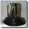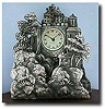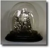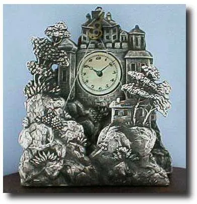 Miniature Zappler clock with two pendulums. Silver castle facade with mother-of-pearl dial and blued moon hands. Unusual second silvered piece in front of the clock with rocks, trees, and a house. On ebonized wooden base with (newer?) dome. Case Excellent Height 3 inches Dial Excellent Circa 1840 Movement Excellent
