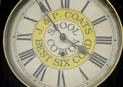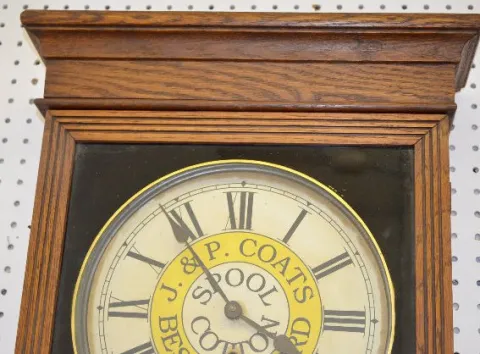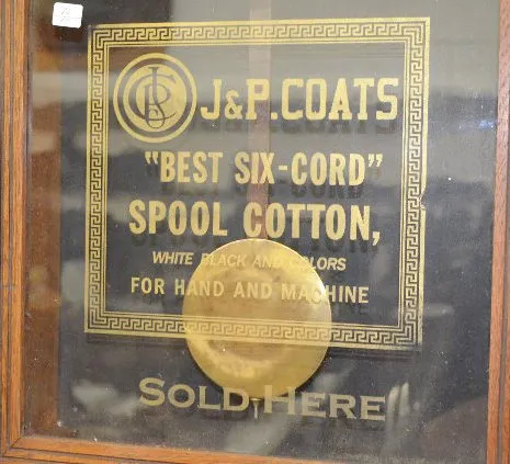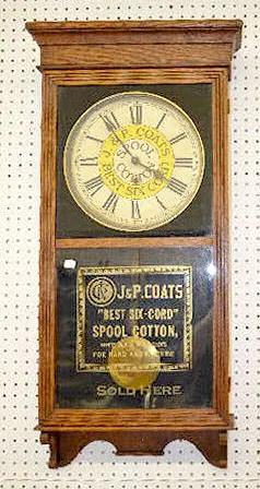 With a TO movement and a paper dial that reads "J. P. Coats Best Six Cord Spool Cotton"; the lower glass reads "J. P. Coats Best Six Cord Spool Cotton...