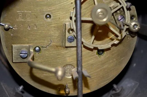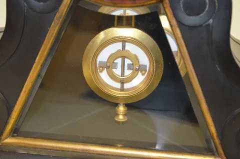 With a T&S movement marked "Vincenti B.C. 2144"; an unmarked porcelain dial with visible movement and the pendulum. The clock is running and striking ...