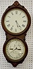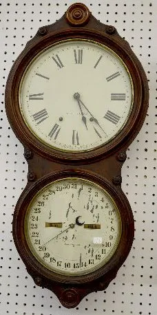 With a T&S movement; a painted metal upper dial marked "Seth Thomas"; and a painted metal lower dial that reads "Patented Feb. 15, 1876"; walnut case....
