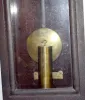With a TO movement; an 11 3/4" marked painted metal dial with 2nds bit; the pendulum, key and weight. Not tested. (The case has darkened. There is som...