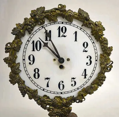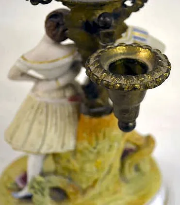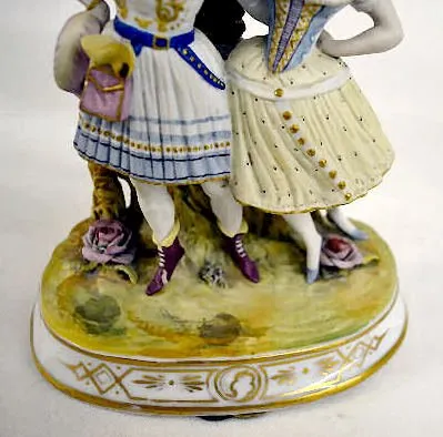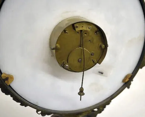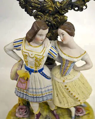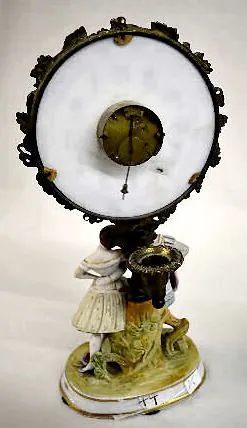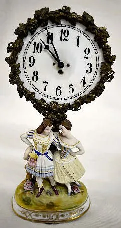 With a TO movement and a milk glass dial with a grape and leaf frame; and the porcelain figure of a courting couple in period clothing. There is an in...