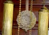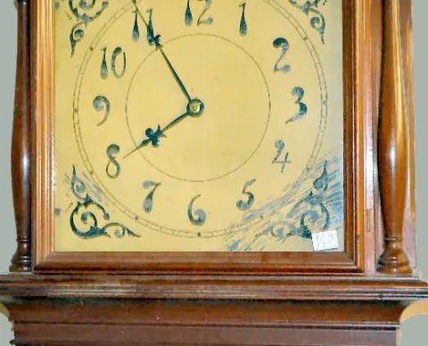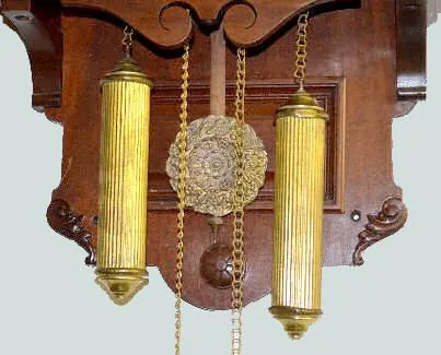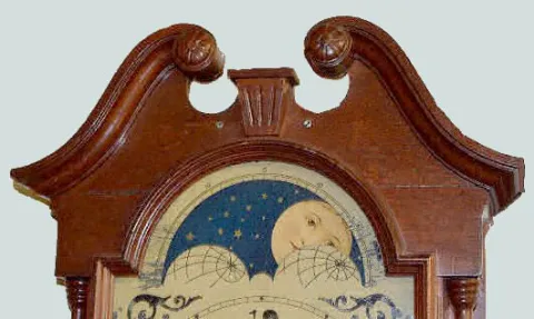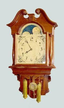 Weight driven with a T&S movement with moon phase dial. It has the pendulum and 2 weights. Not tested. (There is no top finial. The wood is split on t...