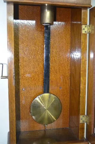 With an 8 day TO weight driven movement and a metal dial. In a solid veneer oak case with the key and pendulum. The spring winds OK. Not tested. (The ...