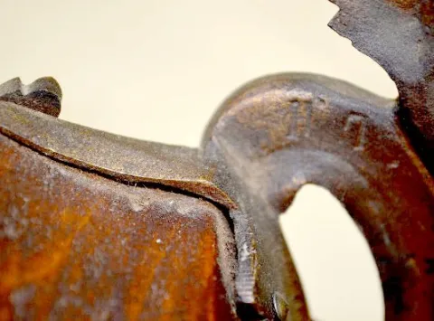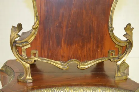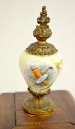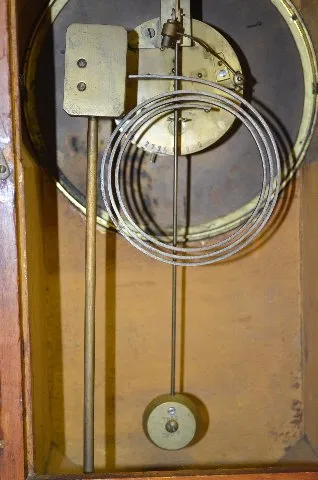 With 1/2 hour gong strike movement, No. 2774. The case, which is framed in metal decorations, is topped with a painted porcelain finial. The box it si...