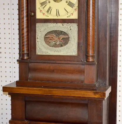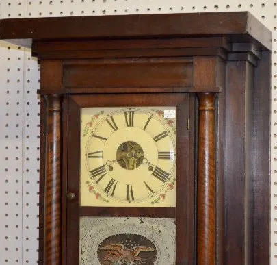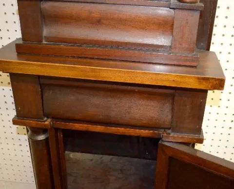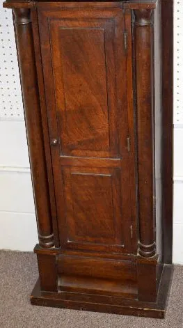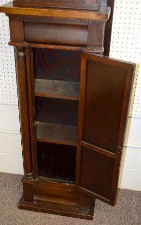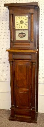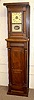 With an 8 day T&S signed movement; a painted metal dial; an interior label; the pendulum and 2 weights. The clock is built into a cabinet with a shelv...