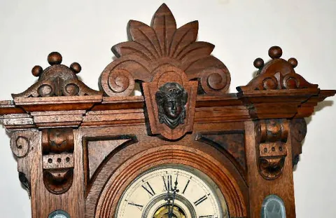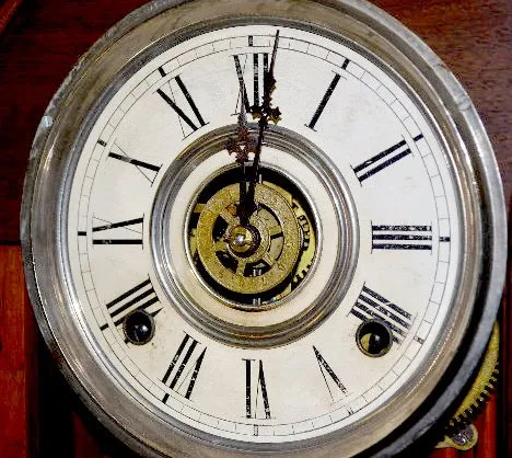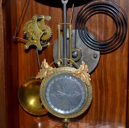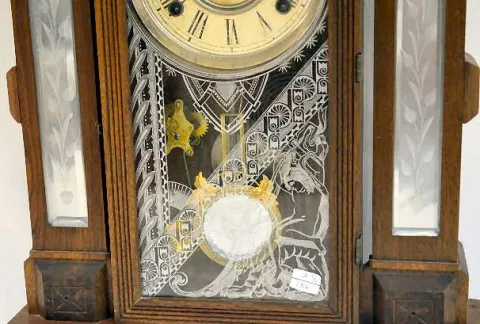 With an 8 day T&S with alarm movement; an unmarked paper dial and a Cut Glass mirror pendulum. (The clock winds and strikes only for a few minutes. Th...