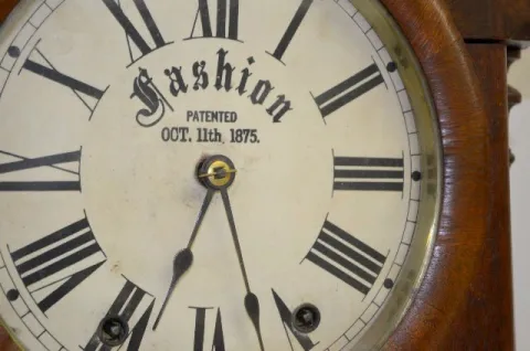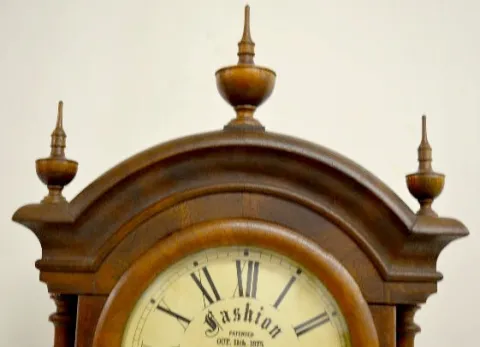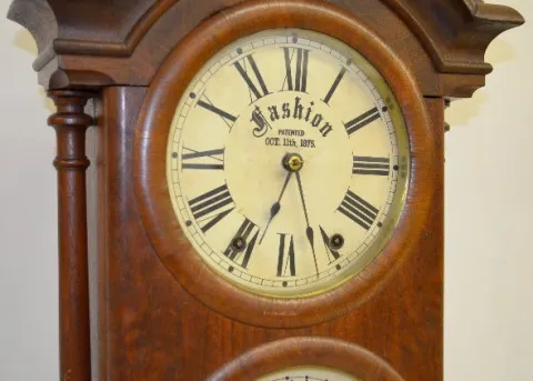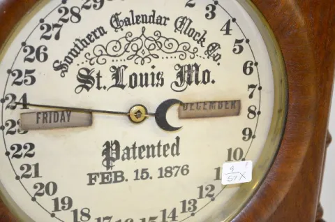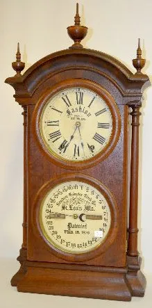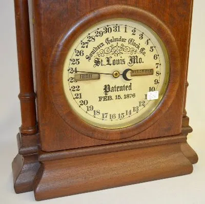 In a walnut veneered case with a T&S movement; an upper dial marked "Fashion" and a lower paper dial marked "Southern Calendar Clock, St. Louis, Mo." ...