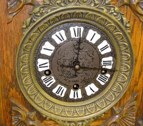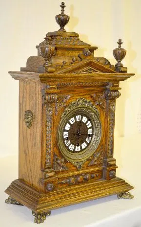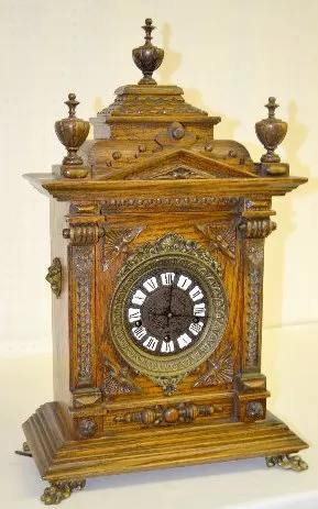 With an 8 day T&S with 8 bar strike and chime movement. The metal dial with a nude lady center has porcelain cartouche numerals. There are metal lion ...
