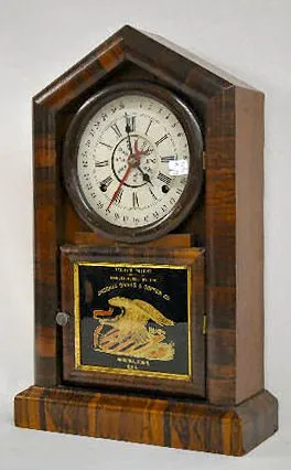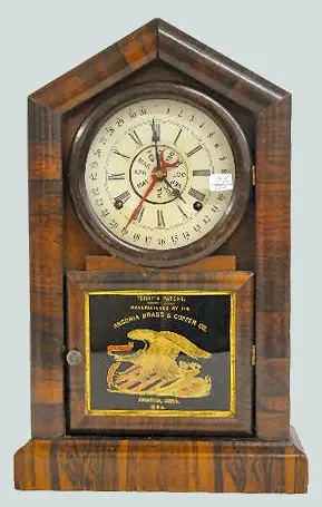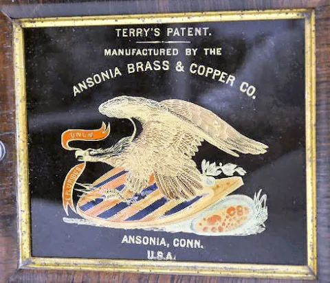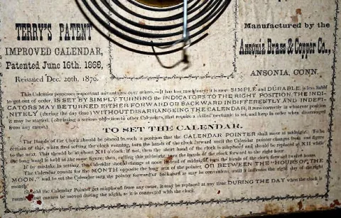 w/ Terry's Patent Calendar: In a veneered case with an 8 day T&S movement; unmarked metal dials; the door has a decal that reads "Terry's Patent Manuf...