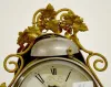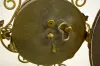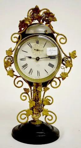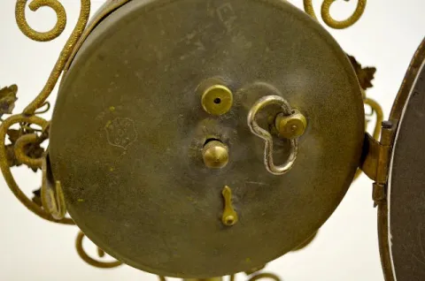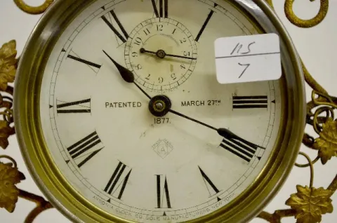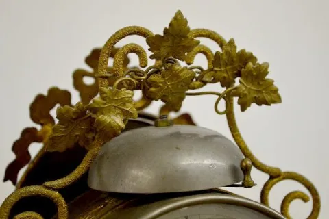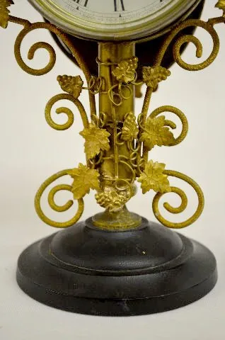signed Ansonia and dated 1877 patent; cast iron base; ornate brass and metal frame with grape style leaves; bell strike alarm; back side of alarm cloc...