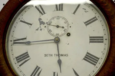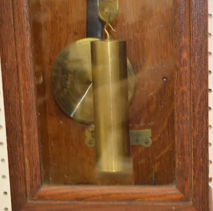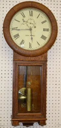 With a TO movement; a painted metal dial marked "Seth Thomas"; the weight, pendulum and key. Not tested. (The paint on the dial is chipped.) 36" Long...