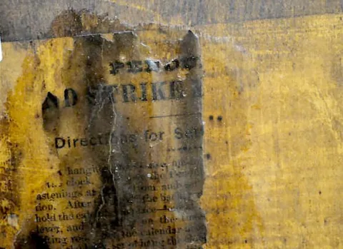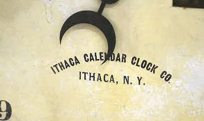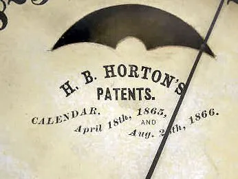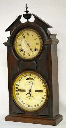 With an 8 day T&S movement; an unmarked metal upper dial and the bottom dial, marked "H.B. Horton's Patents, Ithaca Calendar Clock Co.". The clock is ...