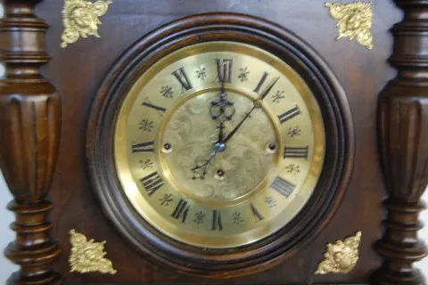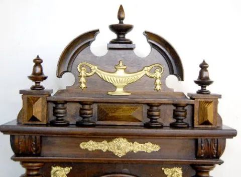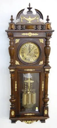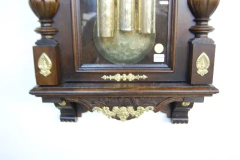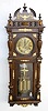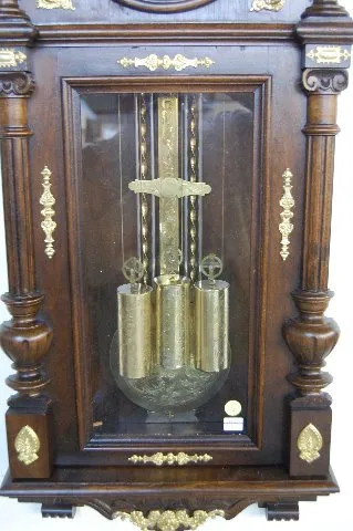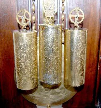 T & S; matching engraved dial, pendulum and 3 weights; metal ornaments on the case; movement has been overhauled. Running at this time. 47" T...