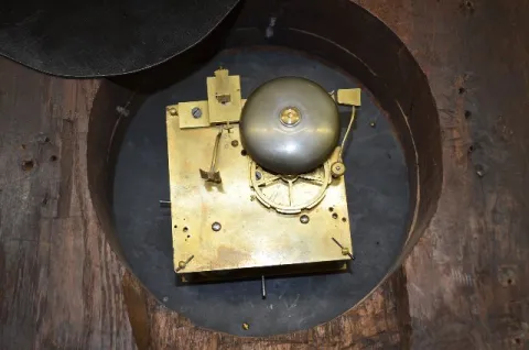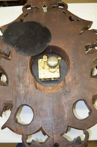 With a T&S unmarked movement and porcelain cartouche numerals. The case is carved with grapes, leaves, shell, flowers, horns and a Devil mask. Not tes...
