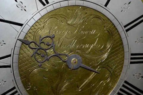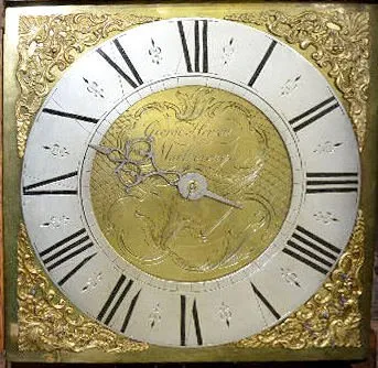 With bell striking movement and a dial with an engraved brass center. George Hewett, the maker's whose name is engraved on the dial, was an early 18th...