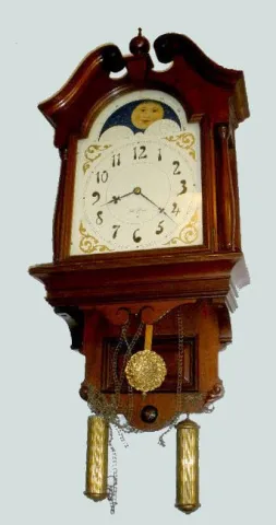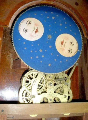 With an 8 day T&S movement; cathedral bell gong and a marked painted metal 12" dial; the pendulum and the 2 weights. Not tested. (The moon dial is ori...