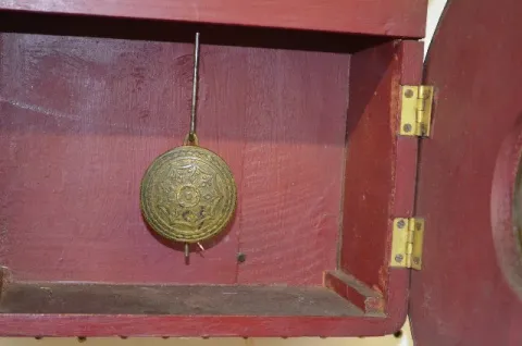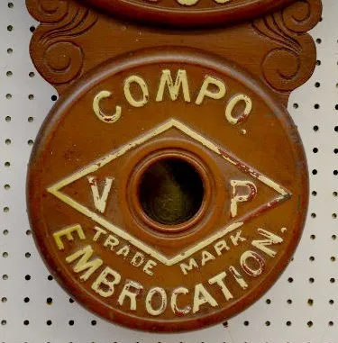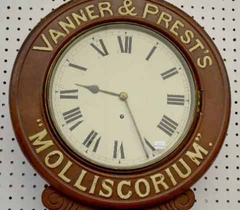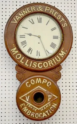 With a TO movement; an unmarked metal dial; and in a case that reads "Vanner & Prest's Molliscorium Compo Embrocation V P Trade Mark". The pendulum is...