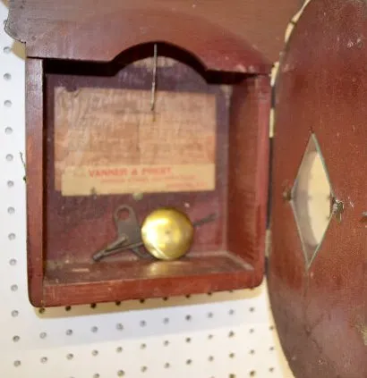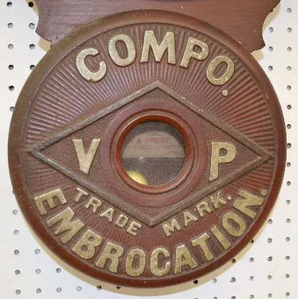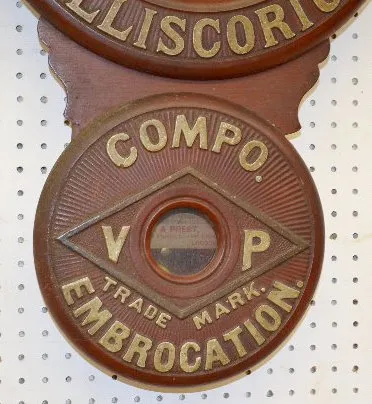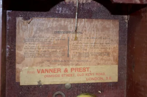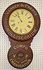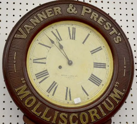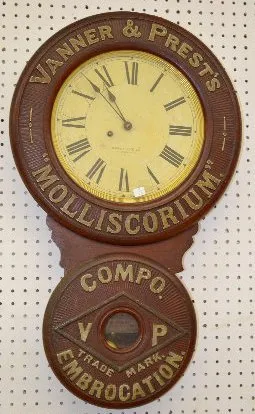 With a TO movement; a paper dial marked "Baird Clock Co."; advertising "Vanner & Prest's Molliscorium Compo Embrocation, V P Trade Mark" with Vanner &...