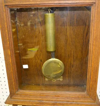 With an 8 day TO movement; a marked painted metal dial; the pendulum and weight. Not tested. 49" Long...